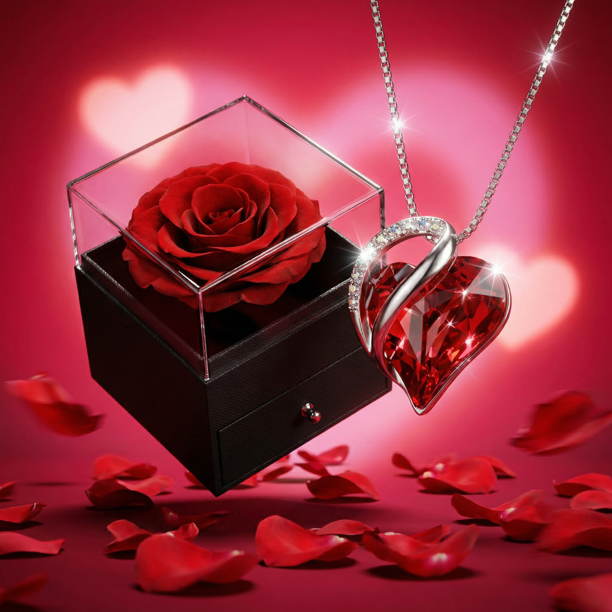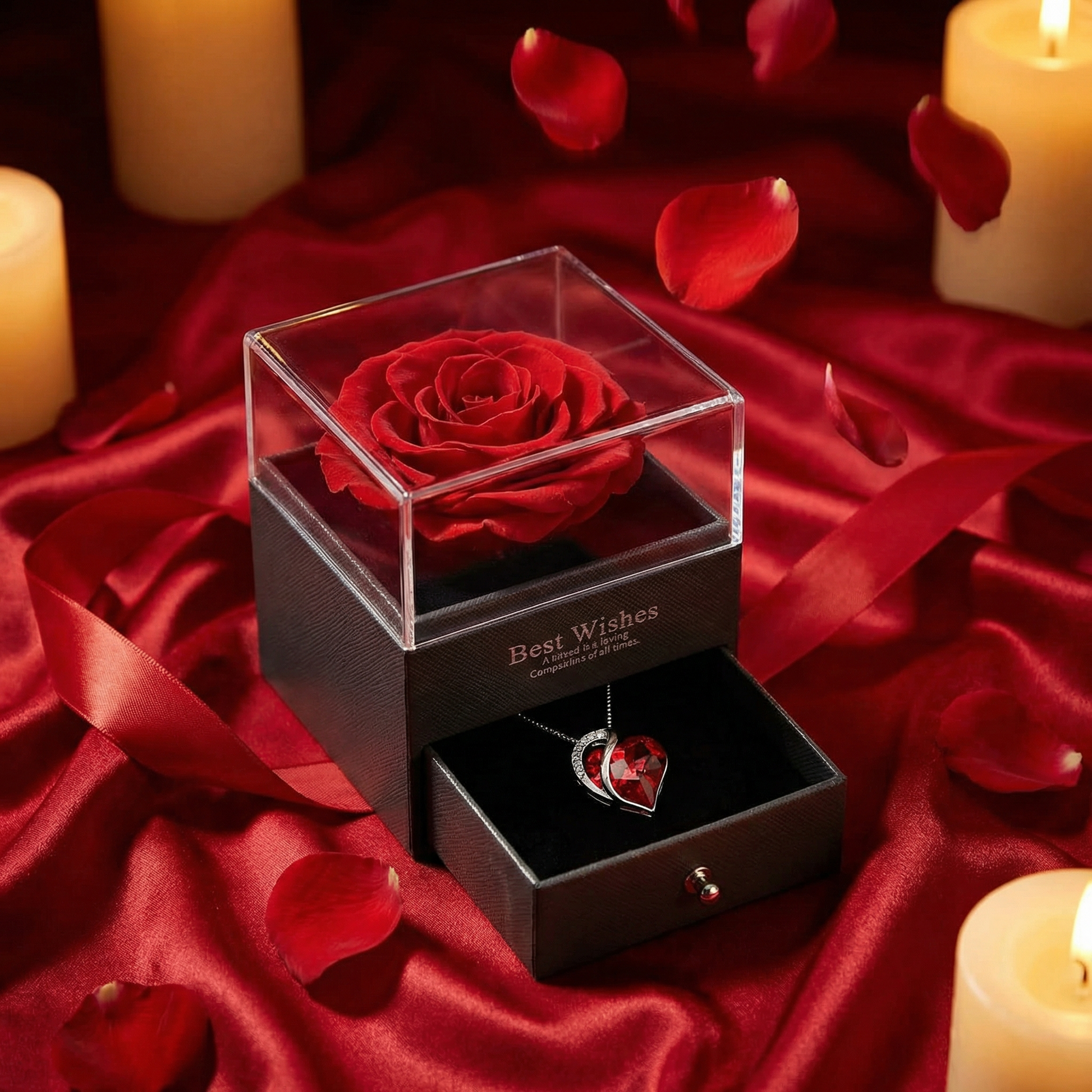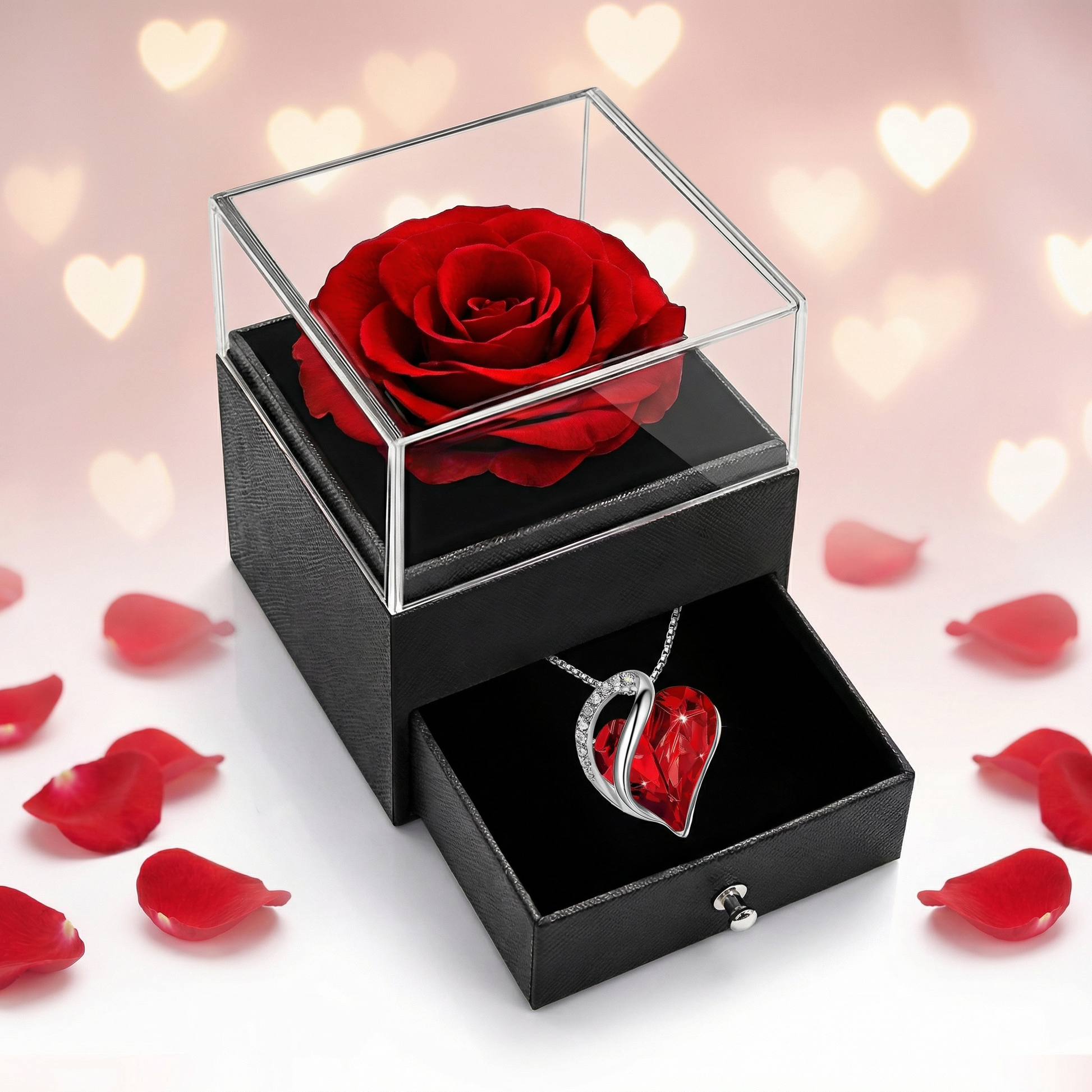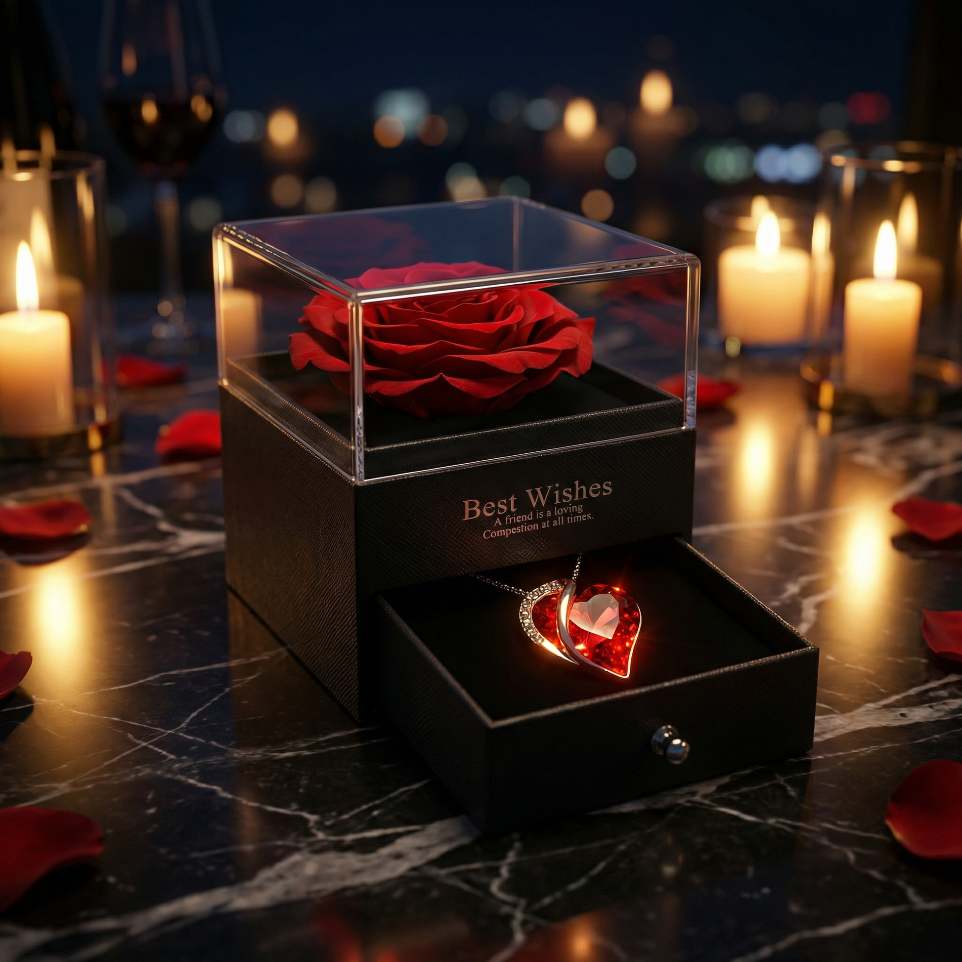 Każdy detal — od róży, przez naszyjnik, po pudełko — mówi jedno: jesteś dla mnie ważna.